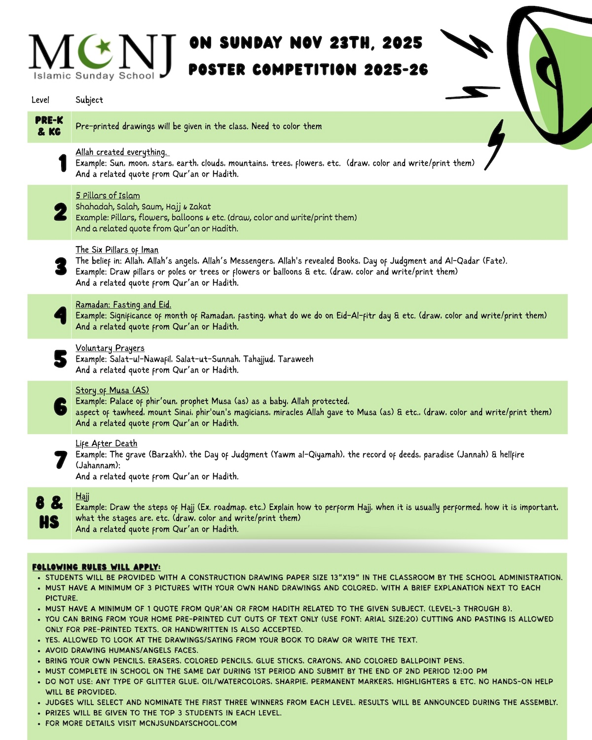 There will be a poster competition in the class on Sunday, Nov 23rd, 2025. All students are encouraged to practice at home and come prepared for this event.